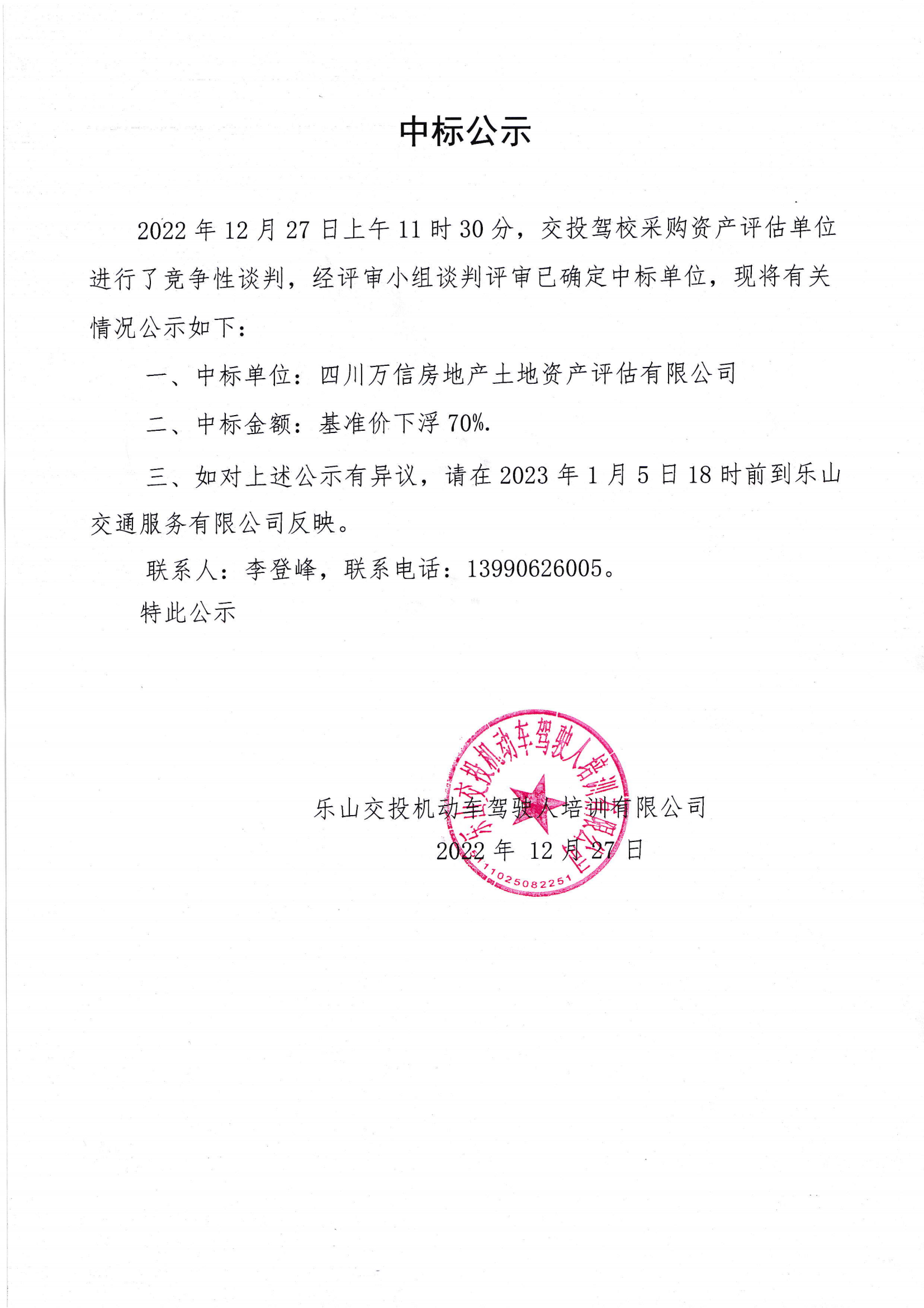 中标公示(四川万信房地产土地资产评估有限公司)