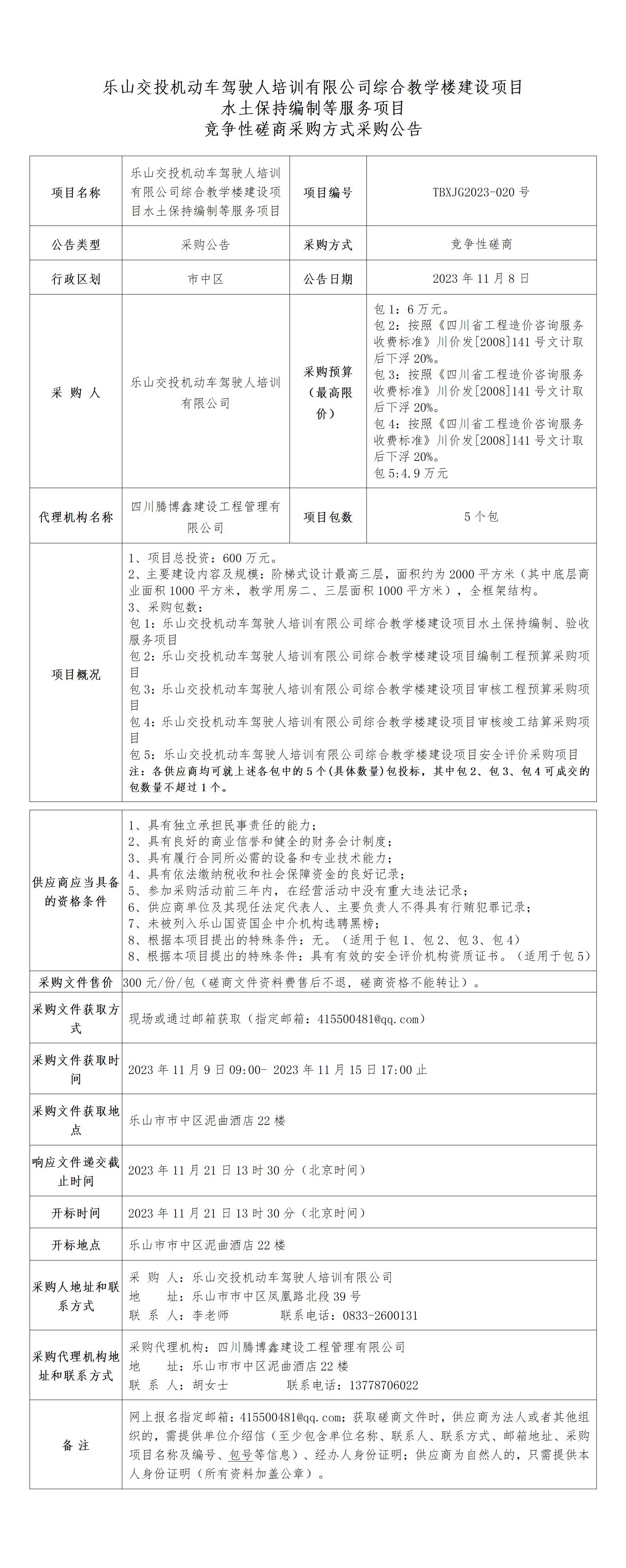 乐山交投机动车驾驶人培训有限公司综合教学楼建设项目水土保持编制等服务项目 竞争性磋商采购方式采购公告