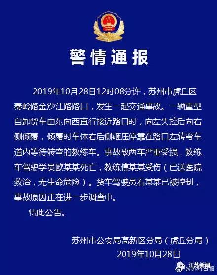 事故致两车严重受损,教练车驾驶学员欧某某死亡,教练傅某某受伤(已送医院救治,无生命危险)。货车驾驶员石某某已被控制,事故原因正在进一步调查中。